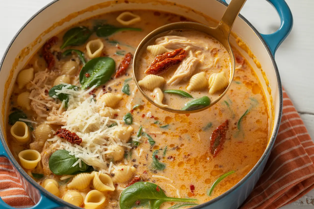It’s made from tender chicken simmered with garlic, Italian herbs, sun-dried tomatoes, spinach, heavy cream, and Parmesan cheese, all blended into a velvety, comforting soup that feels like a warm hug.